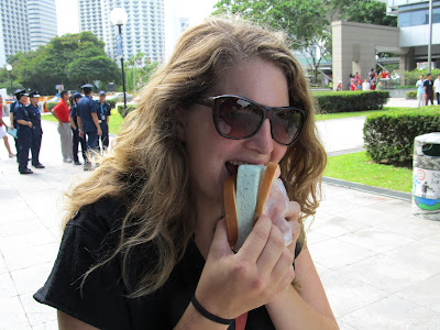 On our way back to Eric’s apartment, we were faced with some road blocks. Apparently it was Singapore’s Independence Day Practice. Although Independence Day isn’t until August 9th, Saturday was devoted to a dress rehearsal of the events. This meant the streets were shut down for a military parade and a fireworks display that evening. Yet another example of the orderliness of the Singapore government; they have a practice Independence Day just to make sure the real one will go okay. On the walk back, Eric introduced me to a Singapore ice cream sandwich which can be acquired for a lovely $1 on the street. And this ice cream sandwich is actually a literal ice cream sandwich. It’s a block of ice cream put between two slices of “sweet bread” (essentially white bread with green and pink food coloring and sugar).